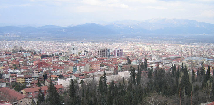 View of the Old City and of its reconstructed southern walls; to the far right Ulu Camii (Great Mosque) and in the background modern Bursa