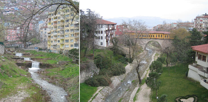 (left) Gokdere River; (right) Irgandi Koprusu, a covered bridge over the same stream (rebuilt in 2002); it was commissioned by a wealthy merchant in 1442 and it had thirty shops. Bursa does not have a proper river, but several small streams coming from the Uludag