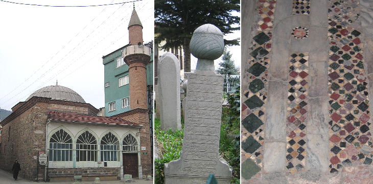 (left) Yer Kapi Camii; (centre) cemetery near the mosque; (right) Byzantine floor inside Orhan Gazi Turbe