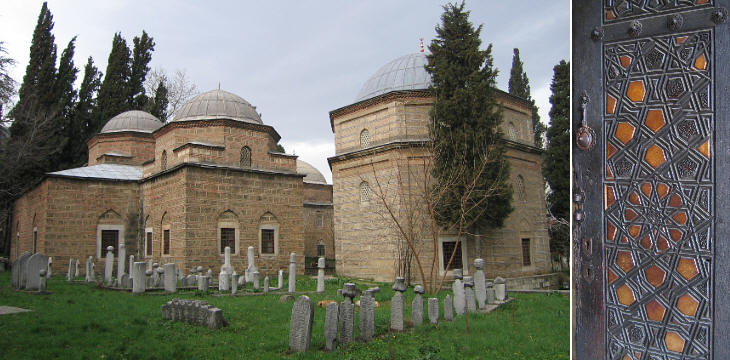 (left) The cemetery of Muradiye and Sultan Murad II Turbe (square) and Prince Ahmet Turbe (octagonal); (right) door of Sultan Cem Turbe