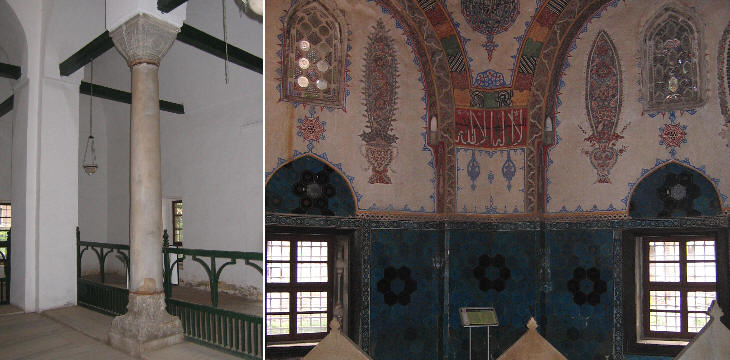 The mosque main entrance and parts of its interior are decorated with tiles having different tones of blue. They were added in the XVIth century after Sultan Selim I brought a group of artisans skilled in the manufacturing of ceramics from Tabriz in Persian Azerbaijan to Nicaea. In 1514 they started the production of the blue-greenish tiles which decorate most Ottoman mosques.