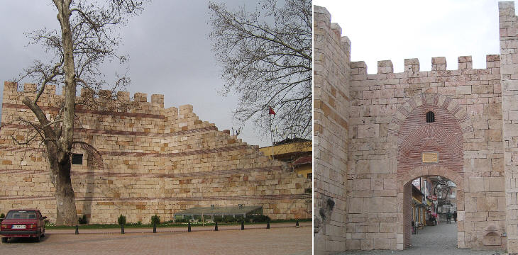 (left) A section of reconstructed Byzantine walls (southern section, near Fetih Kapi, the Conqueror's Gate); (right) Sultanat Kapi (reconstructed)