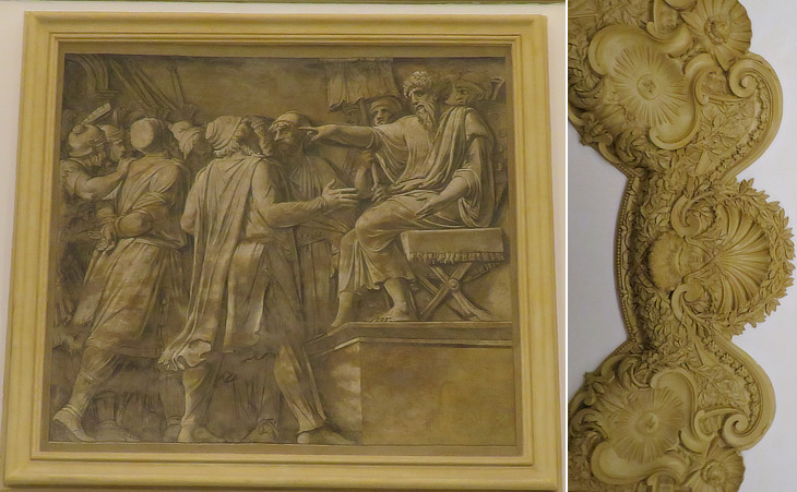 Palazzo Barberini: ground floor apartment next to Borromini's spiral stairs: (left) Trial of Barbarian prisoners by Polidoro da Caravaggio and Maturino da Firenze (see similar paintings at Castel Sant'Angelo and a relief of Colonna Traiana): (right) stucco decoration of the ceiling of a hall with the sun of the Barberini