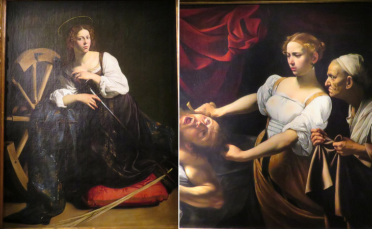 (left) St. Catherine of the Wheel (1599) - Thyssen-Bornemisza Museum of Madrid; (right) detail of Judith at Palazzo Barberini (1602) (it opens in another window)