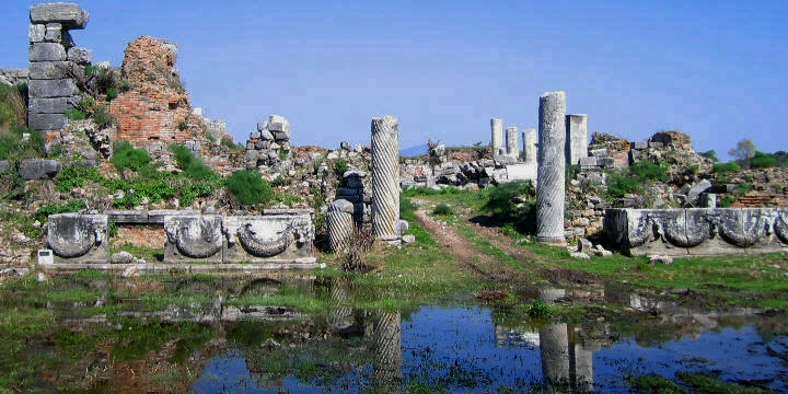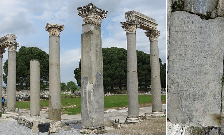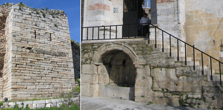 Stones and columns from the Artemision which were used to build the walls surrounding St. John's Cathedral (left) and Isa Bey Camii (right)