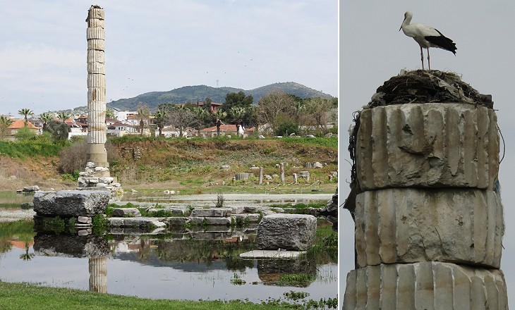 Artemision: (left) podium of the temple; (right) a stork with a passion for antiquities (not the only one)