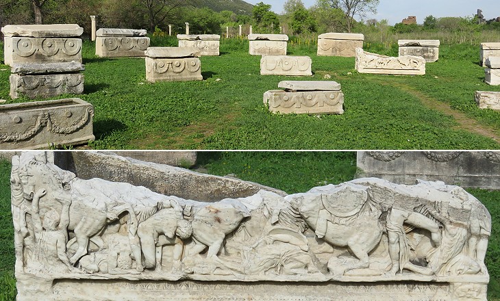 A number of sarcophagi found along the roads departing from Ephesus have been gathered in an open space near Via Arcadiana, the street leading to the harbour. Many of them have a rather simple decoration based on festoons which was typical of the sarcophagi made at Ephesus (you may wish to see a much more elaborate sarcophagus from Ephesus in a page dealing with Roman funerary practices).