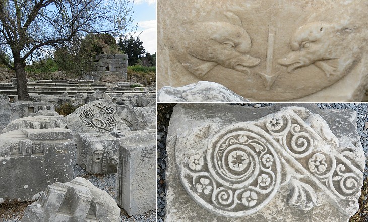 Theatre Gymnasium: fragments of lintels and reliefs including that shown in the background of this page (from various locations of Ephesus)