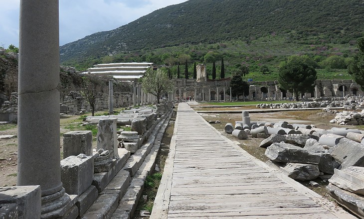 Marble Street leads to the building which is the symbol of Ephesus and of Turkey's archaeological treasures: the Library of Celsus. While the Library is a monument which marks one of the happiest periods of Ephesus' history (it was built in 117 AD), Marble Street is an indication of its decline: it was rebuilt in the Vth century by using marble slabs from former temples and graves.