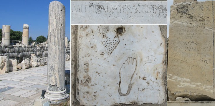 (left) Marble Street; (centre-above) grave inscription for Mithridates Agrippa, co-builder of the Gate of Mazeus and Mithridates (in the pavement of Marble Street, near the theatre); (centre-below) carvings of a heart (?), a foot and a crowned woman head in the pavement of Marble Street; (right) inscription at the end of the street