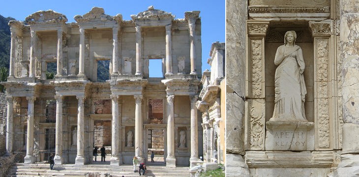 (left) Library of Celsus (and the Gate of Mazeus and Mithridates to its right) in 2006; (right) Areti, personification of Virtue (copy from the original at the Ephesos Museum in Vienna)