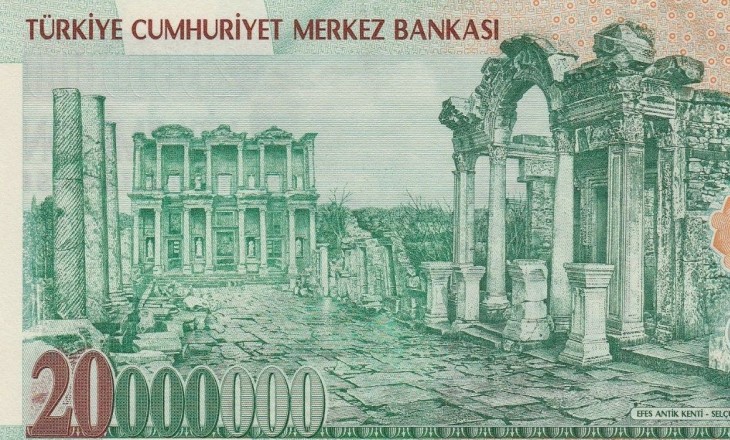 20,000,000 Turkish Liras Banknote issued in 2001 showing the Library of Celsus and the Temple to Hadrian