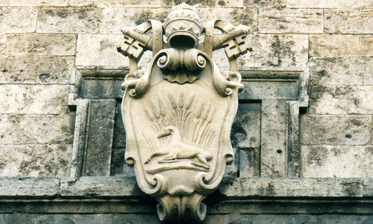 Papal coats of arms: (left) Pius III as a cardinal (in the Cathedral by Andrea Bregno); (right) Alexander VII (at Palazzo Landi, Piazza S. Giovanni)