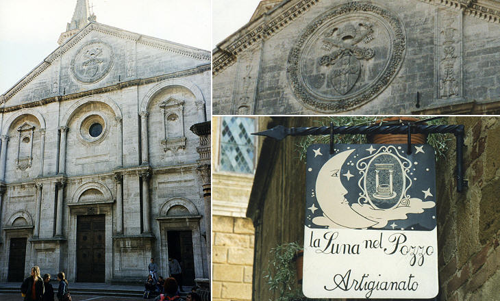 (left) Cathedral; (right-above) coat of arms of Pope Pius II; (right-below) a local shop named after the moon of the Pope's coat of arms