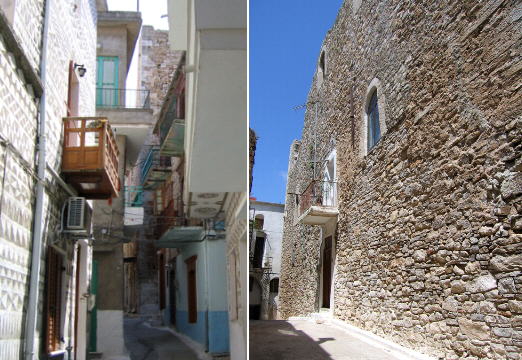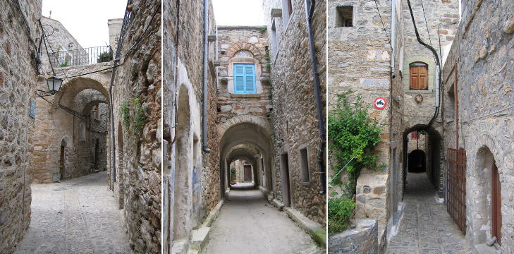 The defence of Mesta was entrusted to the villagers themselves. The corsairs who had managed to penetrate inside the village found themselves in a maze of very narrow alleys covered by archways through which the villagers could easily move and repel the assailants. This layout is impressively similar, although the buildings of Mesta are not as high, to the carrugi, the very narrow streets of the medieval quarter of Genoa.