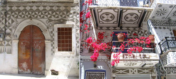 Another link to the Genoese period can be noticed in the decoration of the houses of Pirgi, a kind of graffito, a technique developed in Italy during the Renaissance. Today the decoration, which once was based on very simple geometrical shapes, and which can still be seen on a few buildings, includes many varieties of patterns. The technique too, is no longer the original one.