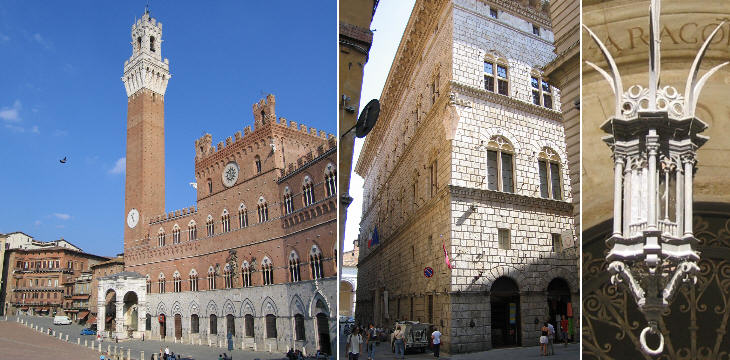 Palazzo Piccolomini (far left) seen from Piazza del Campo and from Banchi di Sotto; detail of the lamp at the entrance