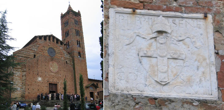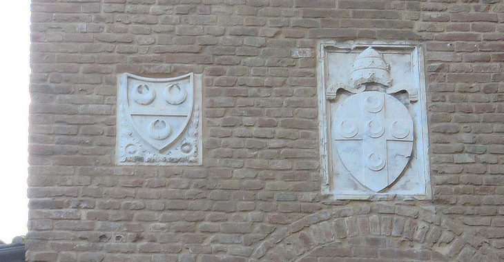 Piazza Tolomei: Coats of arms of the Tolomei (left) and of Pope Pius II Piccolomini (right)