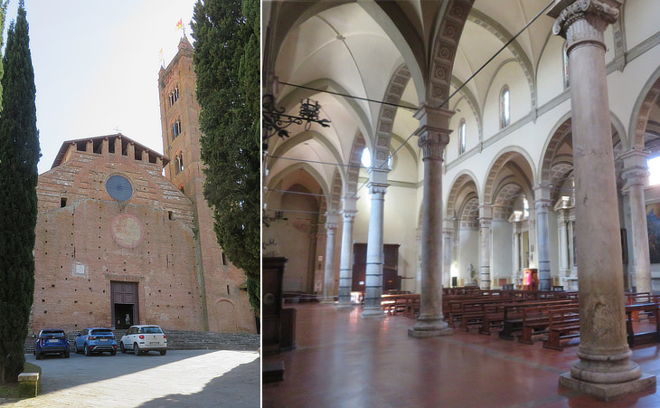Cloister: (left) Gothic portal of the Petroni chapel by Agnolo di Ventura, a sculptor who worked at the Monument to Bishop Tarlati in Arezzo; (right-above) fragment of a fresco by Ambrogio Lorenzetti; (right-below) steps leading to the church