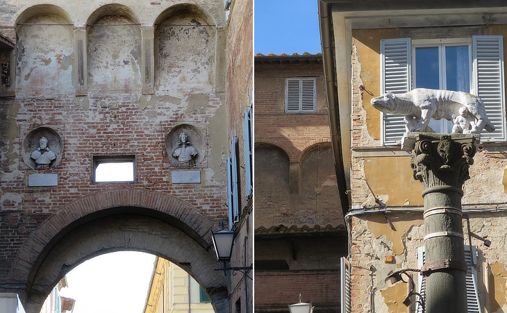 (left) Inner side of Porta S. Maurizio with busts of Grand Dukes Ferdinand I and Cosimo II, his son; (right) She-wolf of Siena outside the gate, one of many similar symbols of the town