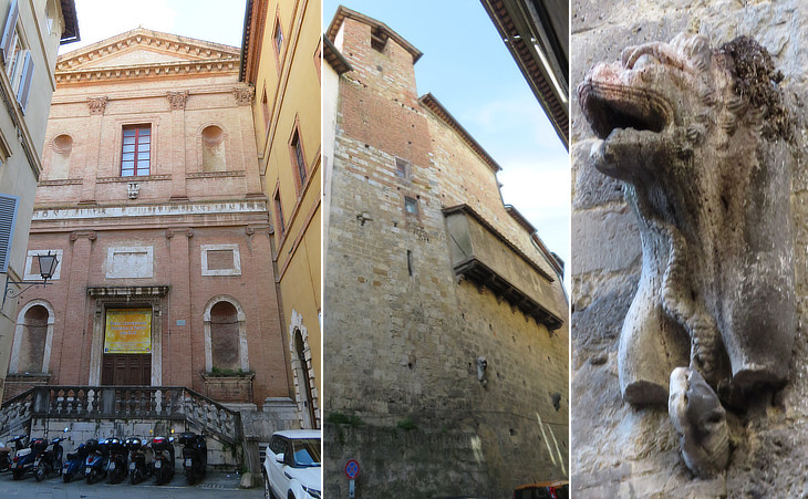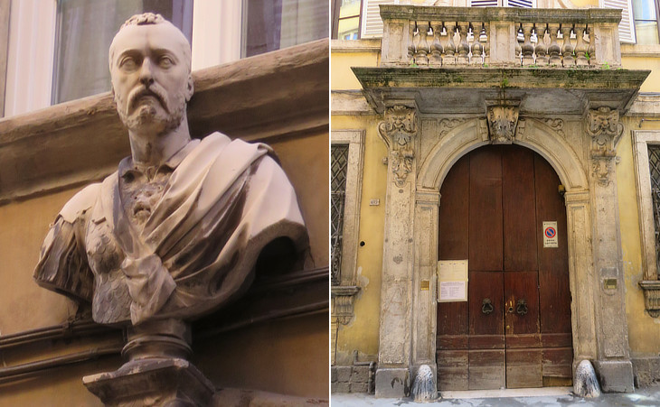 Via di Pantaneto: (left) bust of Francis I, Grand Duke in 1574-1587 with the Collar of the Golden Fleece; (right) Palazzo Biringucci then Landi Bruchi