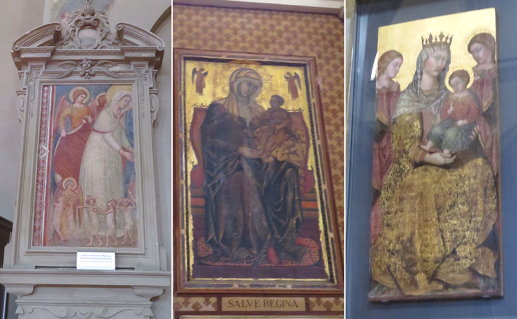 S. Clemente in S. Maria dei Servi: (left) fragment of a fresco depicting the Virgin Mary freeing the souls in Purgatory; (centre) Madonna del Bordone, by Coppo di Marcovaldo (1261); (right) Madonna di Belverde by Taddeo di Bartolo (1405)
