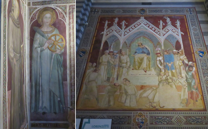 Frescoes: (left) St. Catherine of the Wheel attributed to Andrea Vanni (second half of the XIVth century); (right) Martyrdom of six Franciscan friars by Pietro Lorenzetti (1335-1340) from the Capitular Hall