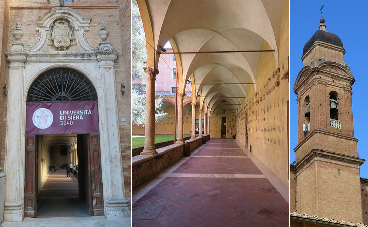 (left) External portal of the cloister (now a facility of the University of Siena); (centre) cloister with fragments from the medieval church; (right) bell tower designed in 1763-1765 by Paolo Posi, an architect from Siena who acquired fame in Rome