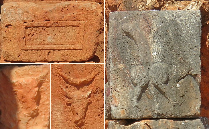 (left) Reliefs supporting the opinion that the site was a "mithraeum": inscription "I(nvicto) M(ithrae) Cultores de suo a solo (a)edifi(c)arun(t)" and heads of bulls; (right) a "fascinus", a phallic symbol placed on a cock (see a similar one at Tyre in Lebanon)