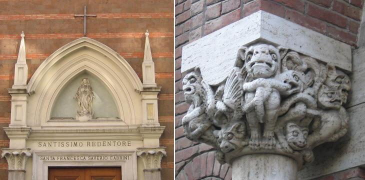 (left) Sacro Cuore al Sallustiano; (centre/right) S. Alfonso dei Liguori: façade and relief showing a copy of "Madonna del Perpetuo Soccorso", a miraculous image