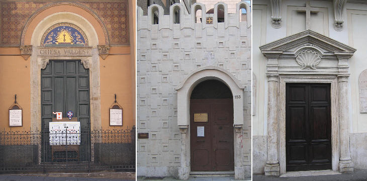 (left) Chiesa Valdese; (centre) S. Andrea; (right) Chiesa Metodista a Ponte