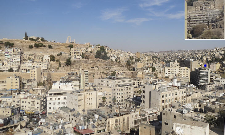 View of the valley of Moiet Amman; the Citadel is on the left and the blue dot indicates the site of the Roman Theatre (in the inset)