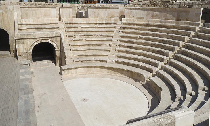 The Roman Theatre of Amman retains its entire cavea (seating area) which was traditionally divided into three sections: ima cavea, the lowest one which was reserved to magistrates and to wealthy citizens; media cavea, the middle section, and summa cavea, the highest section, were probably utilized for a gender separation with men seating in media cavea and women and children in summa cavea.