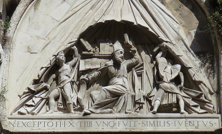 Portal of S. Agostino: St. Augustine destroying the books of the heretics helped by two angels by Giorgio Orsini