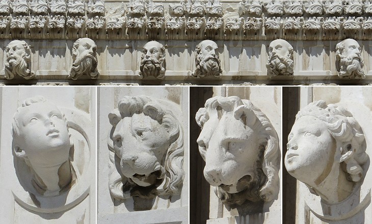 When Orsini was assigned this portal he was involved in the design and decoration of the Cathedral of Sebenico, which is regarded as his masterpiece (hence he is also known as Giorgio da Sebenico). A series of portraits decorating the apse is the most striking feature of that Cathedral and a similar one can be seen in this portal. The heads of bearded saints are merely decorative, but those of boys and lions show great ingenuity of design and execution.