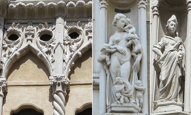Loggia dei Mercanti: (left) detail of the façade; (centre) Charity; (right) Justice
