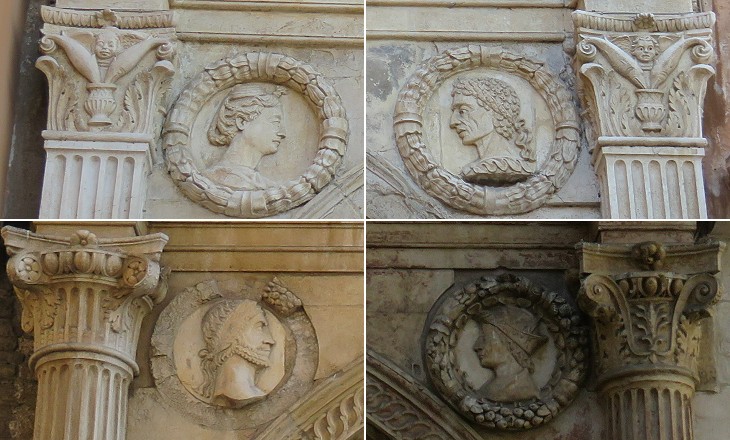 The arches were decorated with six circular reliefs portraying Emperor Trajan, his wife (Plotina), three other unidentified Roman emperors and an unidentified person of the time the arch was built. Because of the hat he vaguely resembles Byzantine Emperor John VIII Palaelogus, who most likely landed at Ancona in 1438 on his way to the Council of Ferrara.