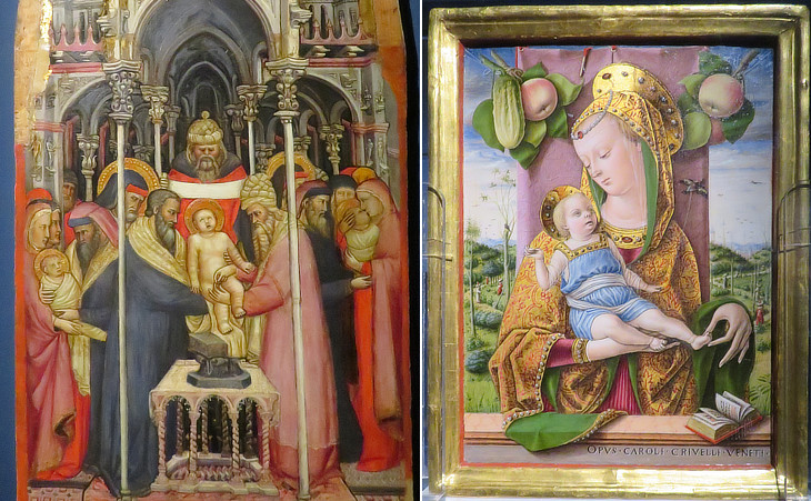 2024 Temporary Exhibition at Palazzo dei Conservatori in Rome: exhibits from Pinacoteca Civica "Francesco Podesti" of Ancona: (left) Circumcision of Christ by Olivuccio di Ciccarello (1430s); (right) Madonna and Child by Carlo Crivelli (1480)