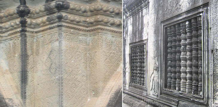 The decoration of Angkor Vat is extremely elaborate and when the walls were not covered by bas-reliefs, they were given the appearance of a silk tapestry; blind windows closed with small columns made the overall design of the buildings more lively.
