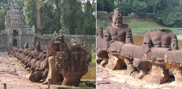 The western entrance is flanked by statues of deva and asura holding a Naga snake: a few years later the Southern Gate of Angkor Thom was decorated in a similar manner (for the meaning of deva, asura and Naga follow the link).