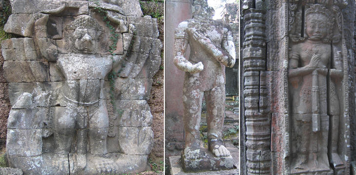 Prah Khan (Holy Sword) was built on the site where the king defeated the Champa and forced them out of the region: this explains why it was decorated with bas-reliefs portraying Garuda, a bird-like creature symbolizing military prowess, and dvarapalas, deities who were armed with clubs and acted as gate wardens. In addition to bas-reliefs the monuments of Angkor were decorated with statues too: these however have survived in limited numbers and in general have been placed in museums in Cambodia and elsewhere: the statue of a dvarapala shown above is one of the few which is still at its original location.