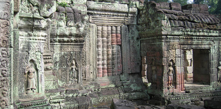 An unusual aspect of many buildings of Angkor is their colour: depending on the level of humidity and on the kind of moss which covered them, walls have acquired green and red nuances.