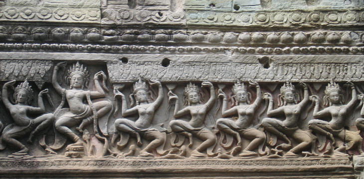 Although the sanctuary of Prah Khan was a Buddhist temple its decoration was mainly based on the traditional Hindu iconography. A small building (today called the Hall of Dancers) is decorated with very lively bas-reliefs portraying a sacred ballet.
