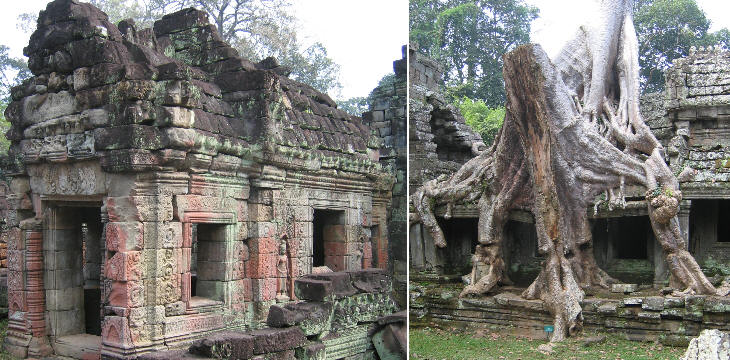 Archaeologists had to cut many trees which had grown over the buildings of Angkor, but they chose not to do this in the case of two silk-cotton trees, the roots of which had replaced the pillars supporting a portico.
