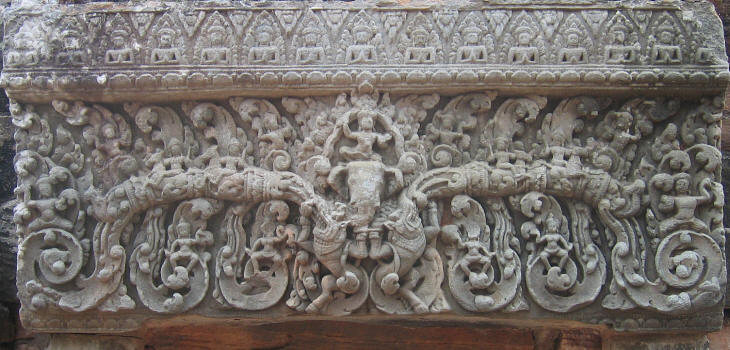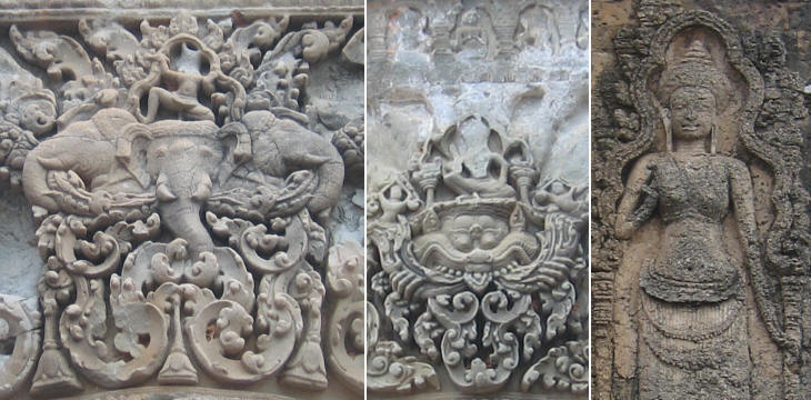 Decorations: (left to right) Airavata, the three-headed elephant; a kala; a devata (dancer)