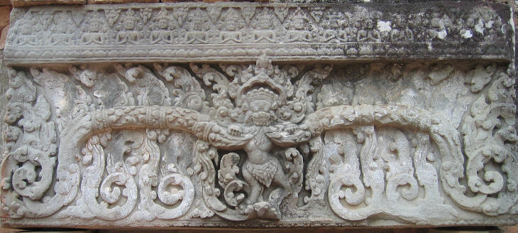 East Mebon was dedicated to Shiva, one of the main Hindu deities: he is viewed as the Destroyer and this may explain why many lintels are decorated with Kala, the time-eater deity represented with an open mouth in the act of devouring something.