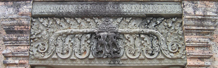 East Mebon is mainly a masonry building, but the lintels were carved on grey sandstone blocks.