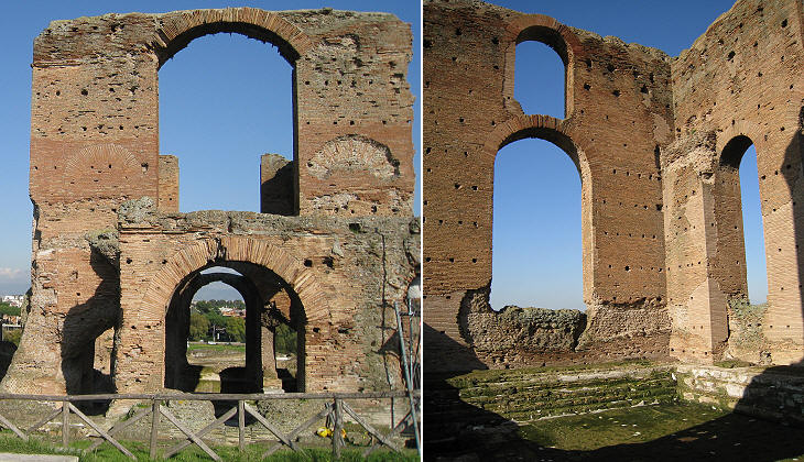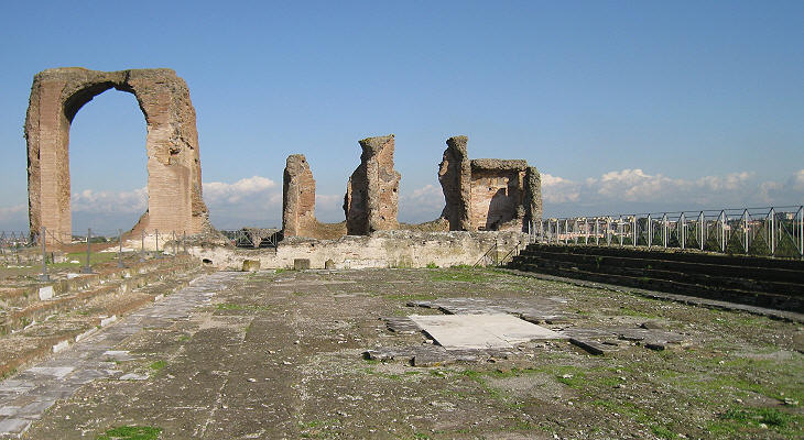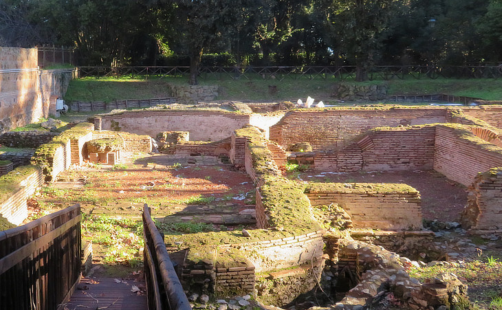 been erected for the most part in the time of the Antonines is certain from the marks on the bricks discovered in 1828 and 1829, all bearing the names of Antoninus Pius, Marcus Aurelius and Commodus. (..) The Casale di Roma Vecchia, now the property of the Torlonia family, is situate on an eminence, which commands the Campagna and