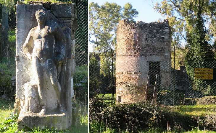 (left) Relief of a military commander in heroic nudity; (right) an ancient tomb/medieval tower inside the military zone of Forte Appio