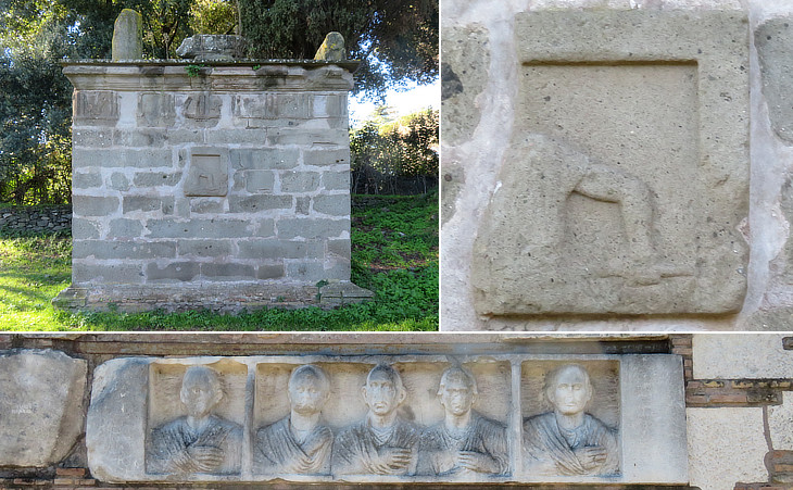 (above) "Doric" monument (thus called because of its simple frieze based on metopes and triglyphs) and fragment of a relief which decorated it, most likely a scene of boar hunt; (below) Sepolcro di Ilario Fusco